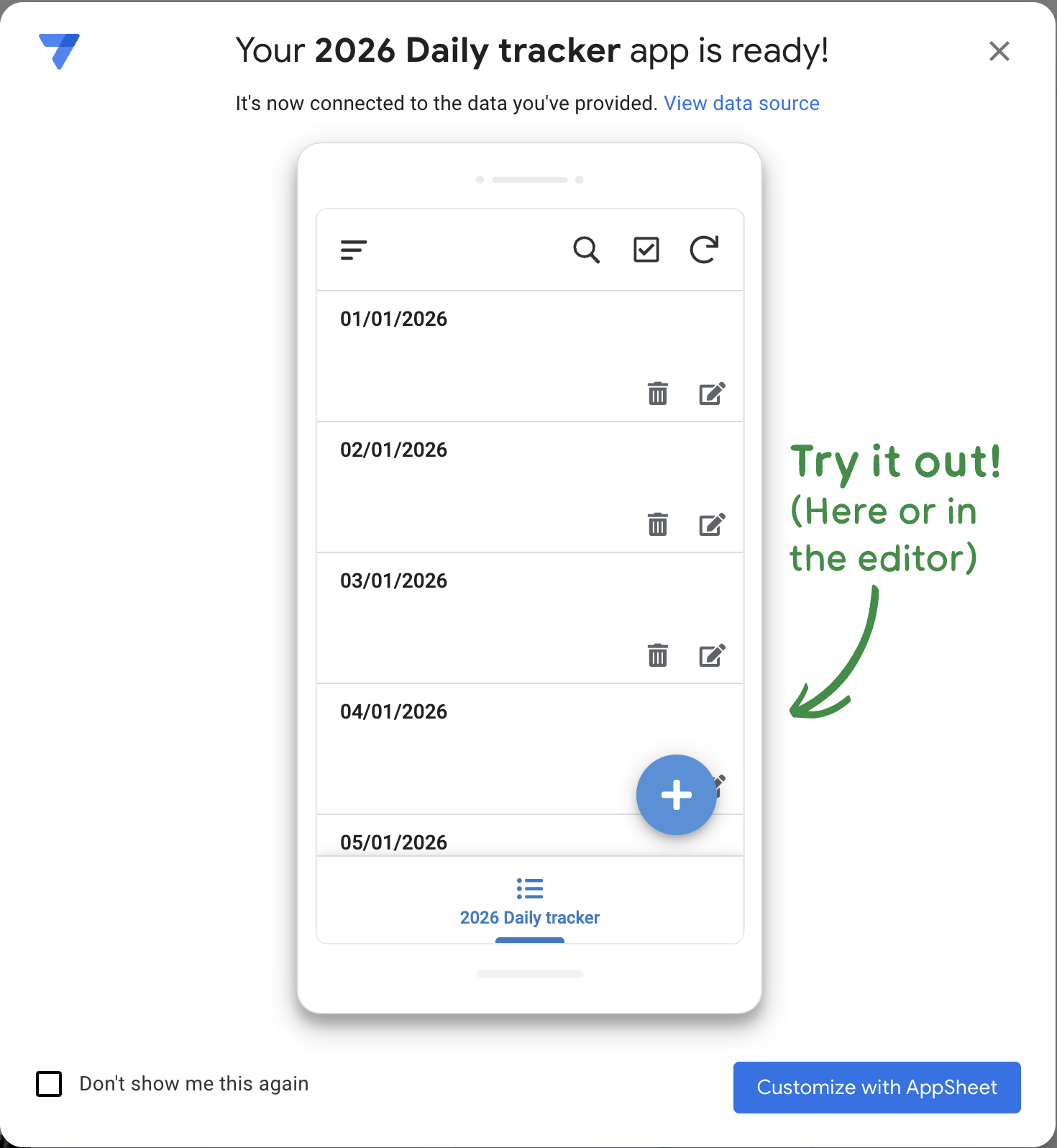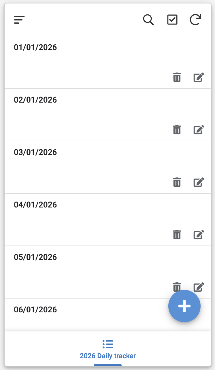 You should now be able to install (on your phone) the app called “AppSheet”, and within it go to “App Gallery” > “Owned by me” > “2026 Daily tracker”, and you’ll be presented with a UI like this (the date format may be different; it shows up in m/d/yyyy format on my phone but dd/mm/yyyy in the screenshot below):