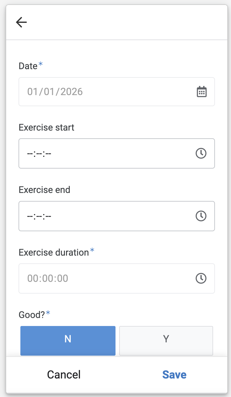 This is the editing UI, where clicking into “Exercise start” defaults to the current time (when you click it), similarly clicking on “Exercise end” defaults to the time when you click that, and clicking “Save” updates the Google Sheet (which automatically computes the duration, which shows up here).