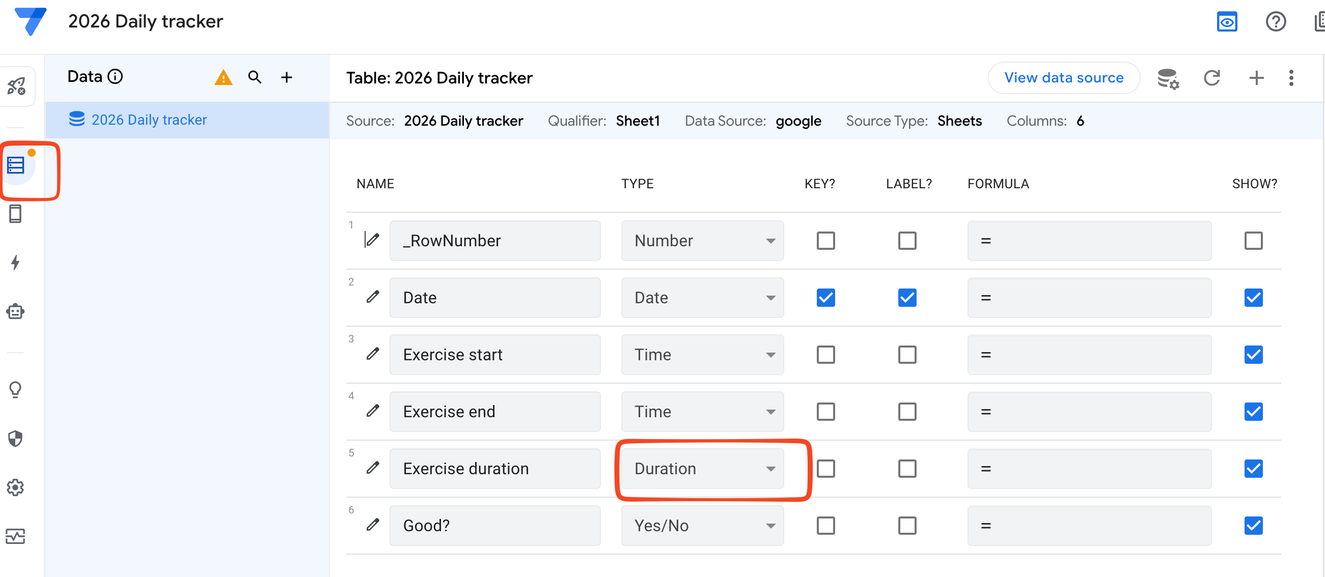 Add the columns you want. For this example, I want to track two things for each date: a duration (for the sake of example, I’ll call it “exercise duration”) and a yes/no value (for this example, I’ll just call it “Good?”). Although I care only about the duration and not the start/end time, it turns out that the app makes it easy to enter the “current” time, so I’ll go ahead and track those as well.