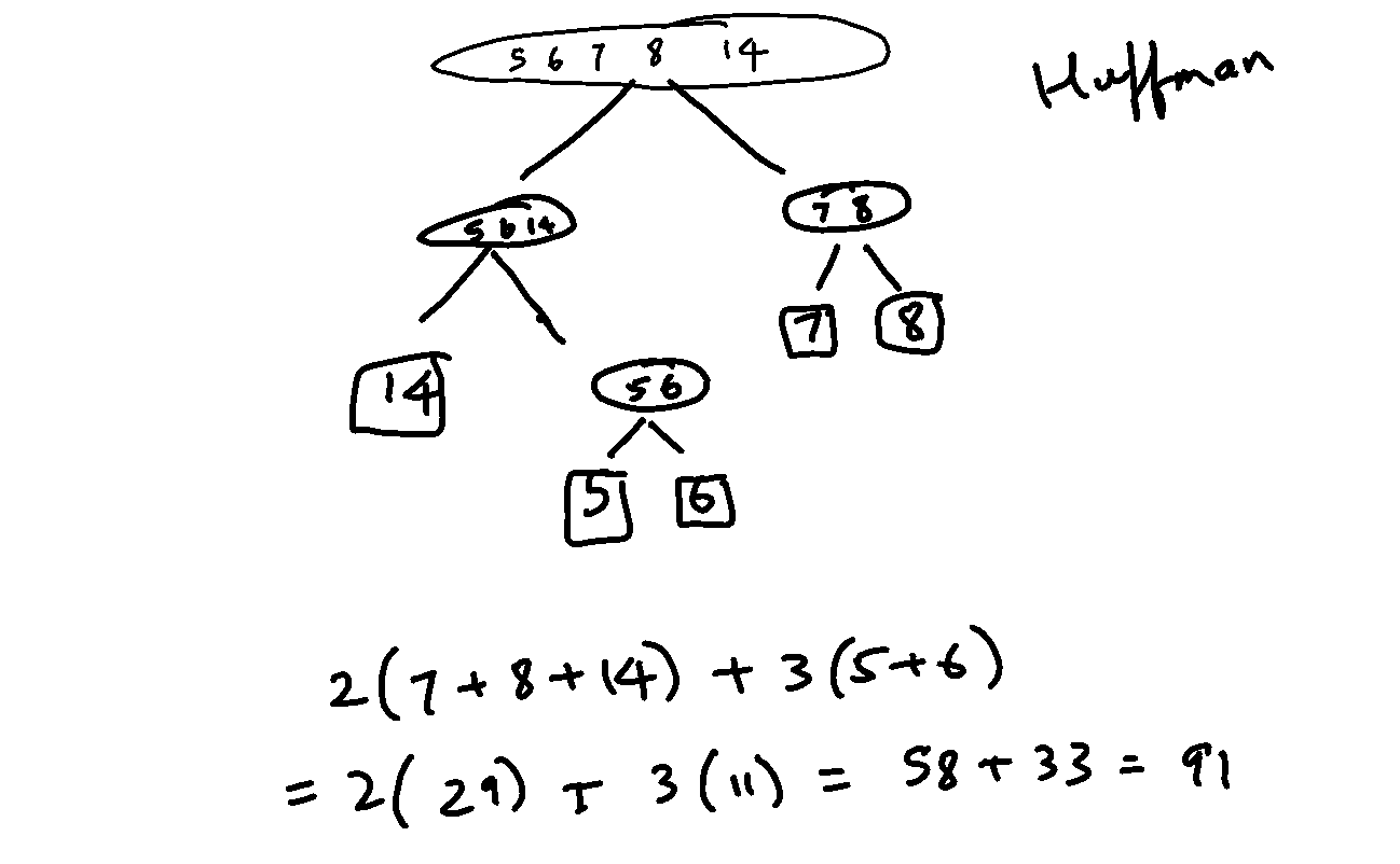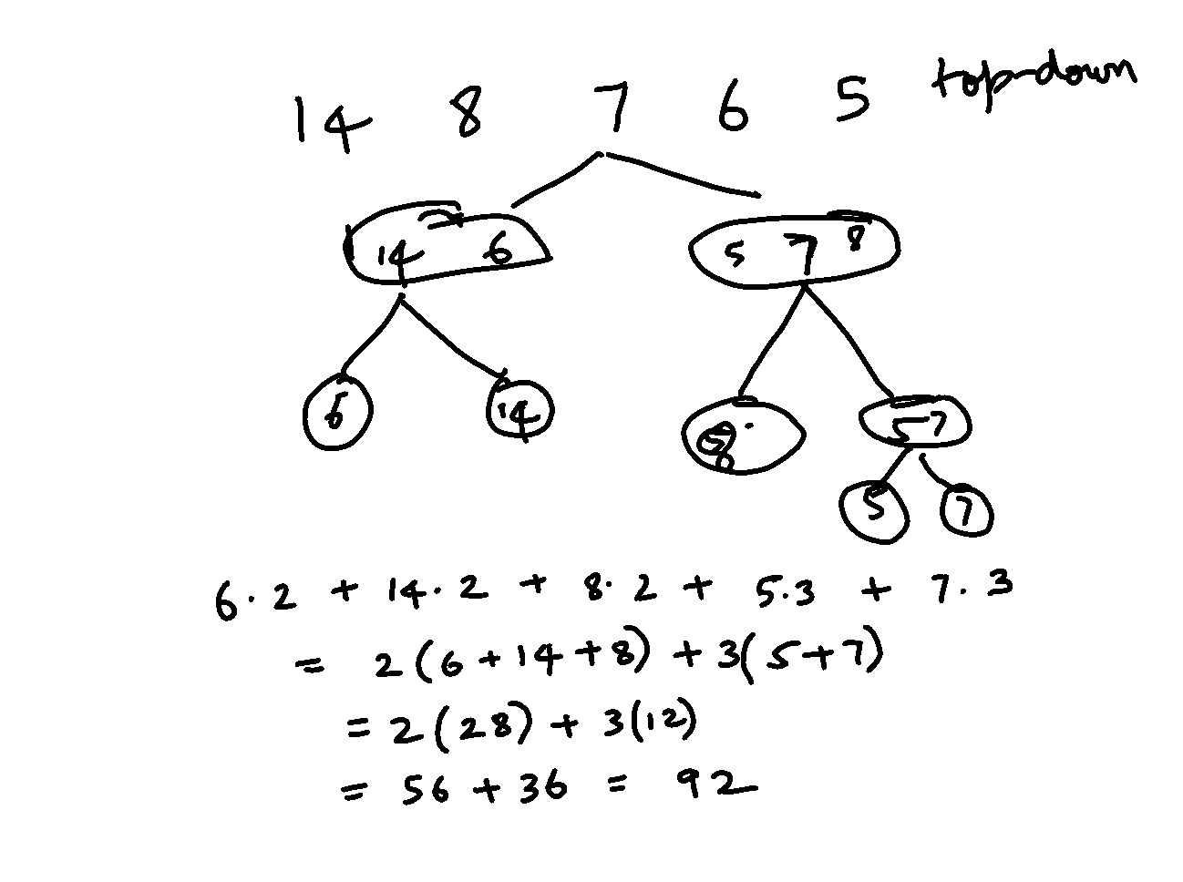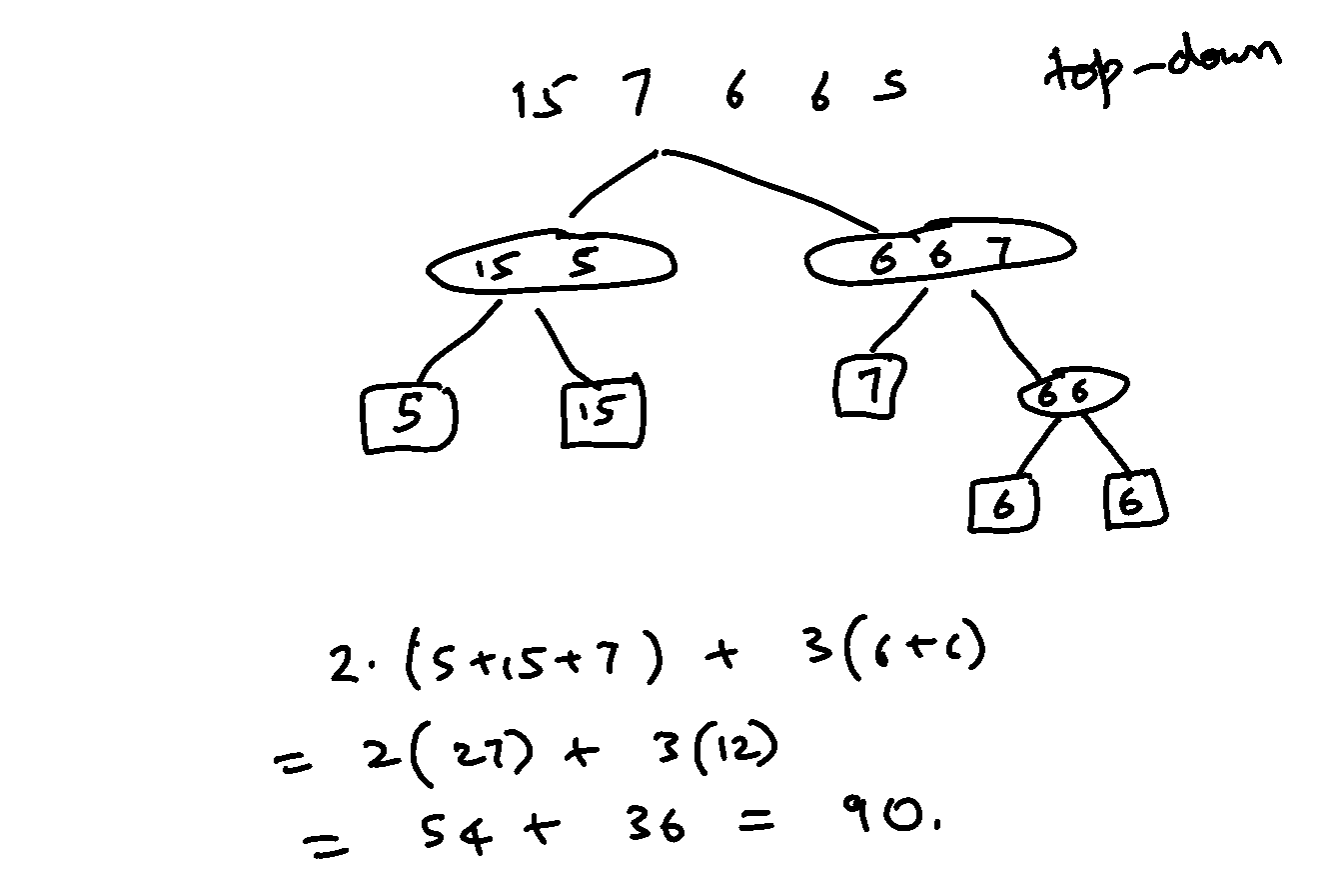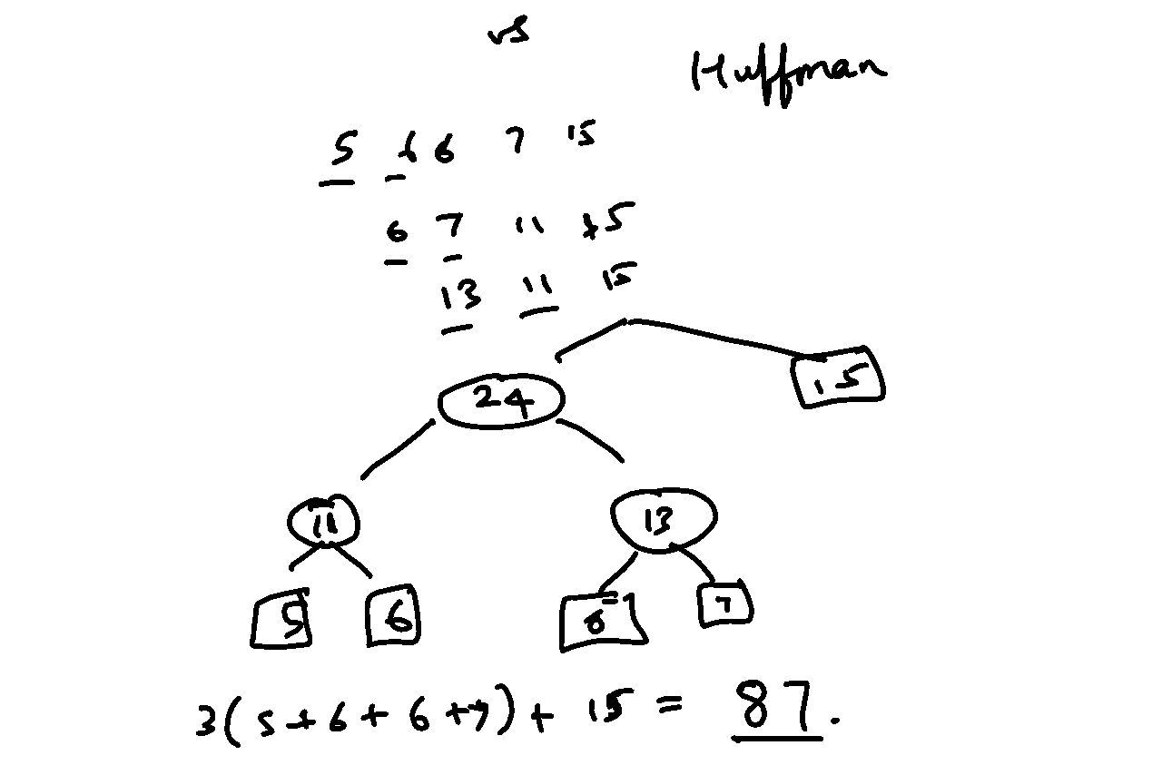 Is this method equivalent to Huffman’s, i.e. does it always give the same/equivalent tree? (Turns out no; we looked at an example where the tree would be different, but in that case it turned out that the tree still has the same total weighted path length.)