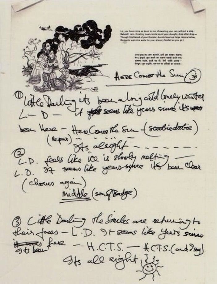 Left: Original lyrics of “Here Comes the Sun” by George Harrison.