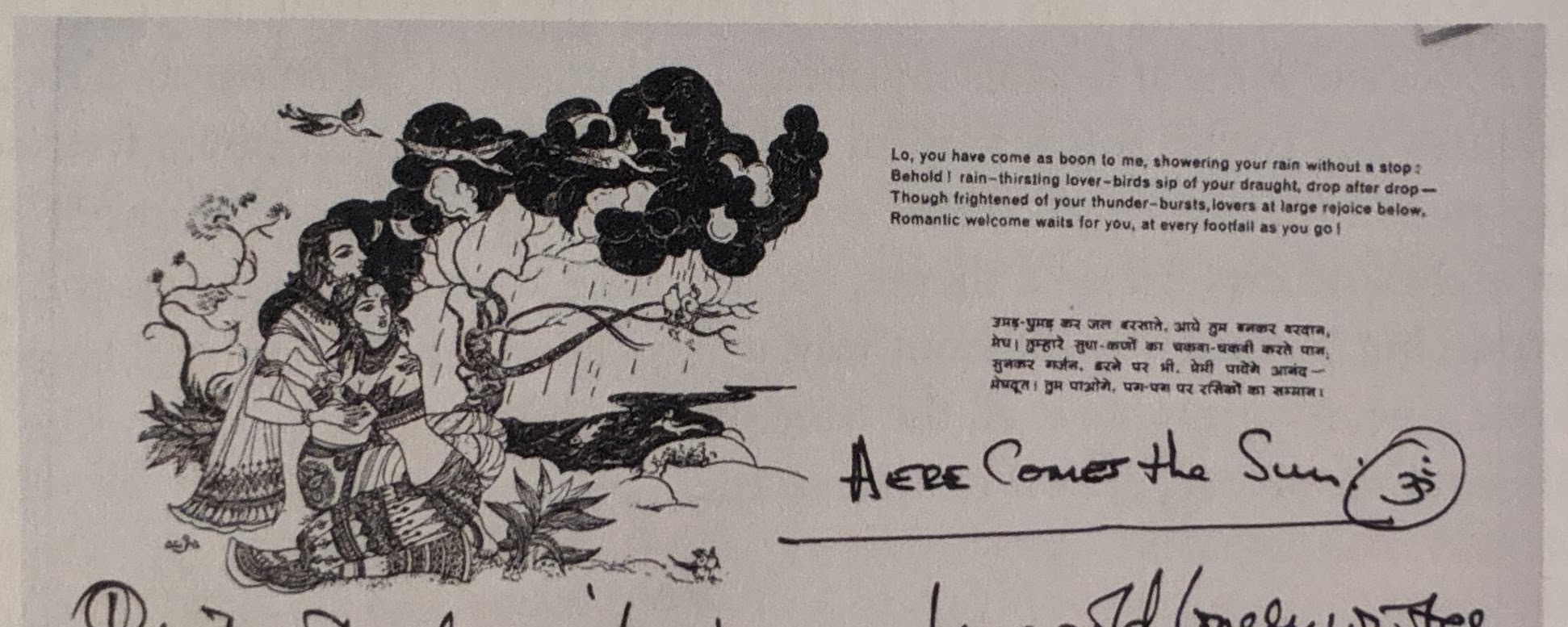 Even with the mystery of what the verse says being solved, there are only further questions: Who wrote the Hindi verse, and who translated it? Where did this piece of paper come from? Are there others like it? (It looks really cool!) There is some stuff in Davies’s book (and, I imagine, other books of his) about the timeline of when the Beatles visited India etc.; maybe one can narrow things down.
