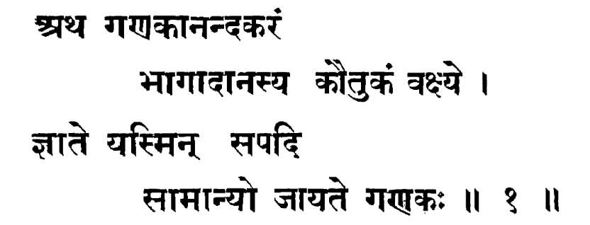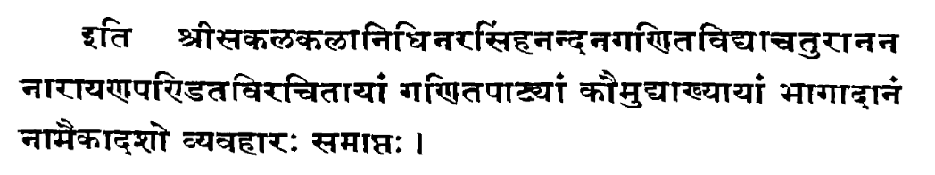 Here ends vyavahāra (chapter) 11, named bhāgādāna (factorization), in the gaṇita text named Kaumudī, by Nārāyaṇa, who is “sakala-kalā-nidhi narasiṃha-nandana” (son of Narasiṃha), and “gaṇita-vidyā-caturānana”. |