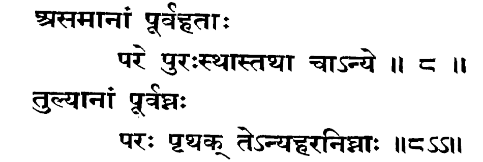 Took me a while to understand but I think the anvaya is: - pūrvahatāḥ asamānāṃ pare purasthāḥ, tathā ca anye = the prior products, in front of the unique [divisors], and also separately.